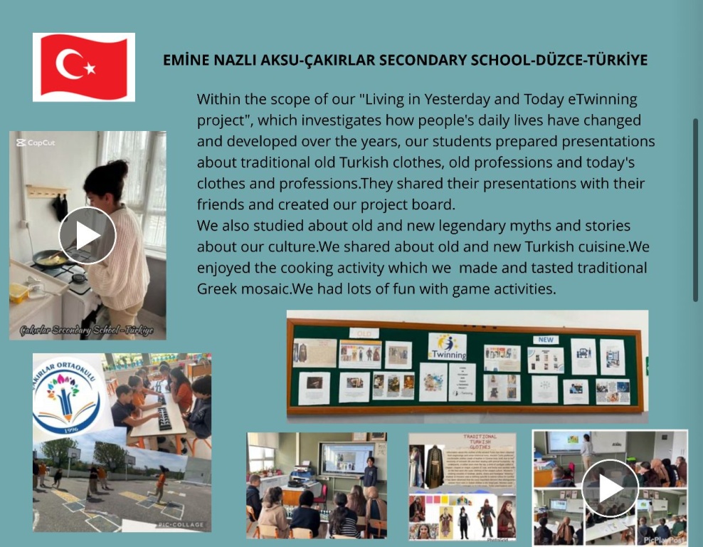 İnsanların günlük yaşamlarının yıllar içinde nasıl değiştiğini ve geliştiğini araştıran “Living in Yesterday and Today” eTwinning projemiz kapsamında öğrencilerimiz geleneksel ve günümüz kıyafetleri, meslekleri, eski ve yeni kültürümüzle ilgili efsanevi hikayeleri, geleneksel Türk mutfağı tatlarını, geleneksel ve günümüz oyunları, şarkı ve danslarını arkadaşlarıyla paylaştılar.